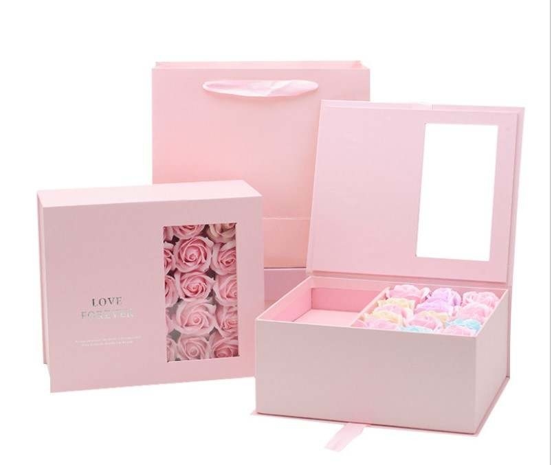 স্বনির্ধারিত রঙের ম্যাট গোলাপী হস্তনির্মিত বক্স স্বচ্ছ উইন্ডো সহ চুম্বক সহ চা উপহার বাক্স